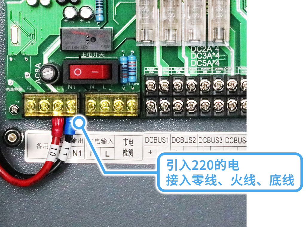 主電部分:先在消防箱引入220的電,接入零線、火線、地線;